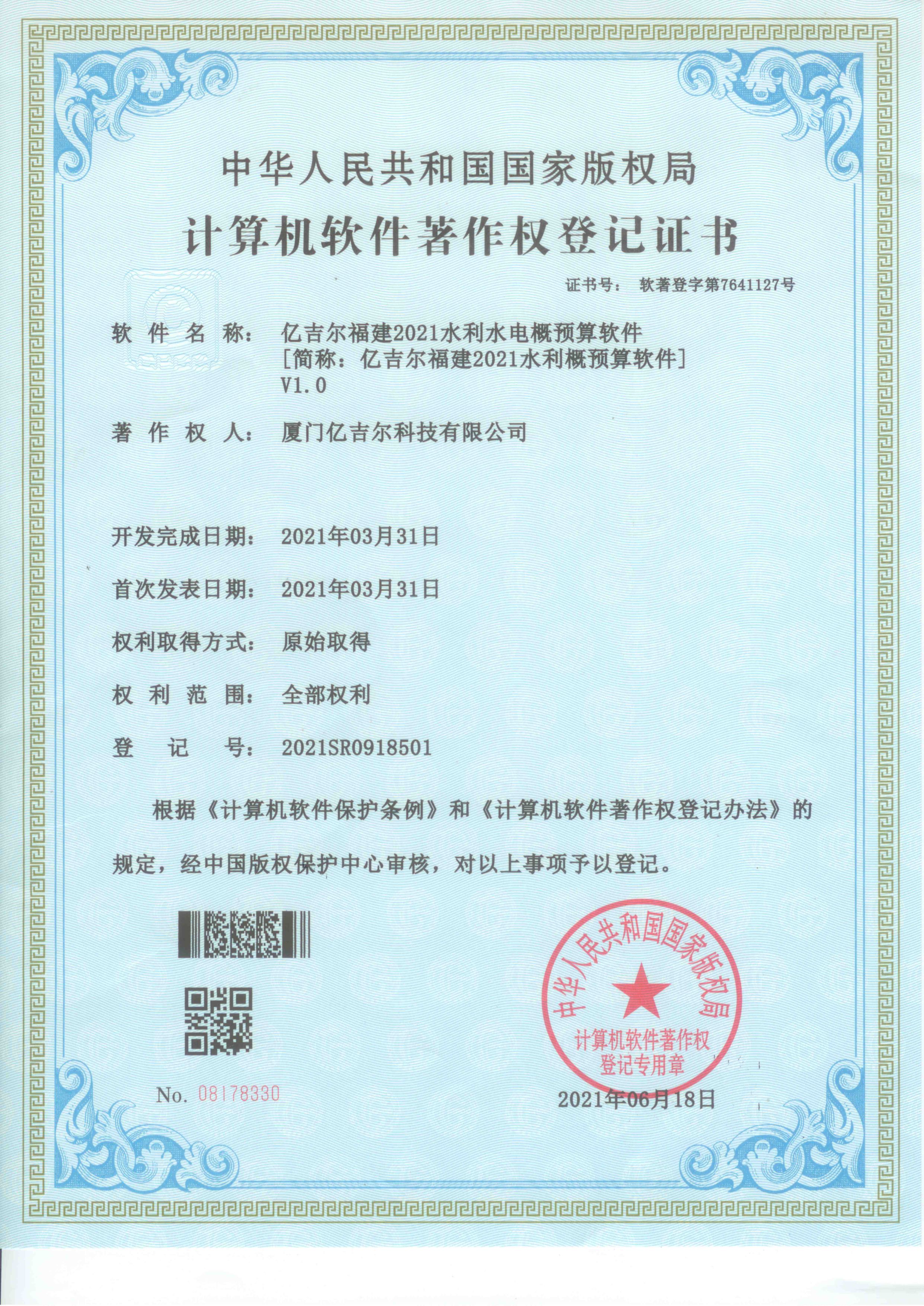 億吉爾福建2021水利水電概預(yù)算軟件著作權(quán)證書 發(fā)布日期:2023年11月22日 瀏覽次數(shù):2641 關(guān)鍵字: 公司 1/1億吉爾福建2021水利水電概預(yù)算軟件著作權(quán)證書