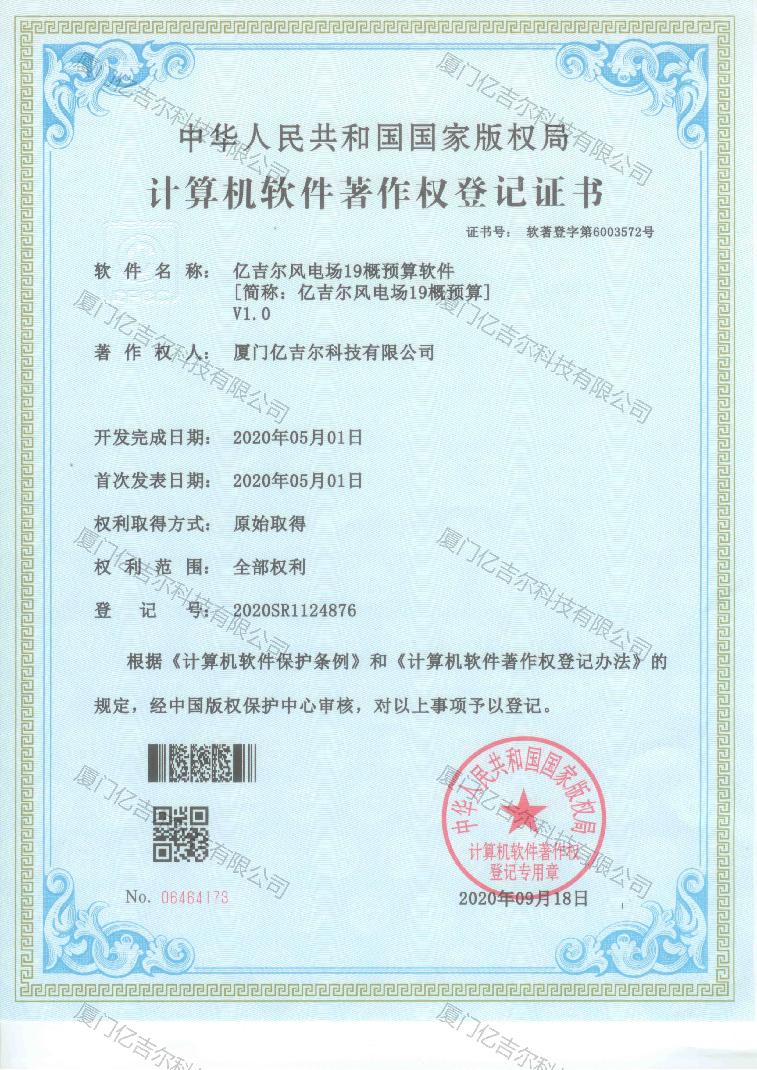 億吉爾風(fēng)電場19概預(yù)算軟件著作權(quán)登記證書 發(fā)布日期:2020年09月18日 瀏覽次數(shù):4426 關(guān)鍵字: 公司 1/1億吉爾風(fēng)電場19概預(yù)算軟件著作權(quán)登記證書