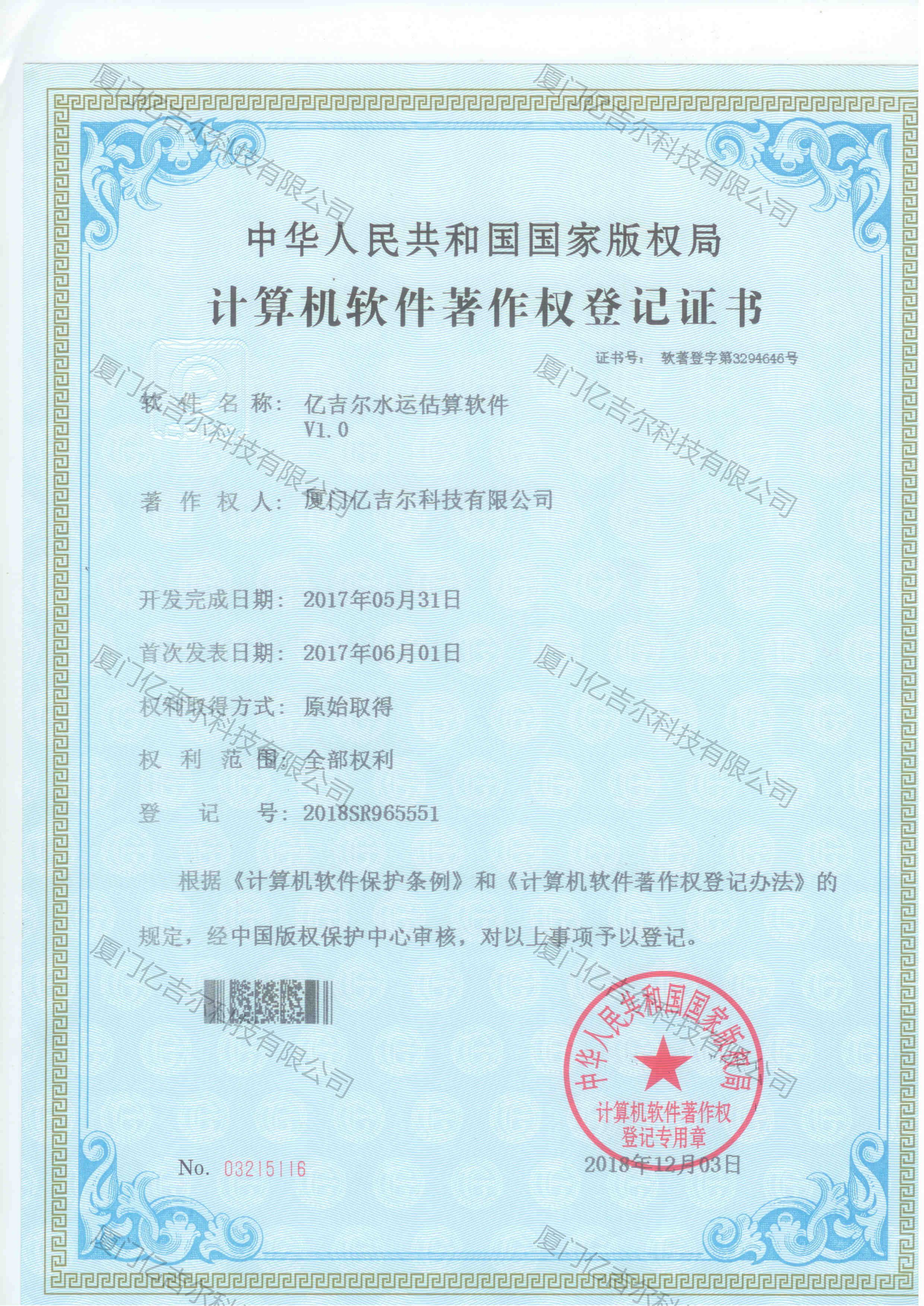 億吉爾水運(yùn)估算軟件著作權(quán)登記證書 發(fā)布日期:2018年12月03日 瀏覽次數(shù):4402 關(guān)鍵字: 公司 1/1億吉爾水運(yùn)估算軟件著作權(quán)登記證書