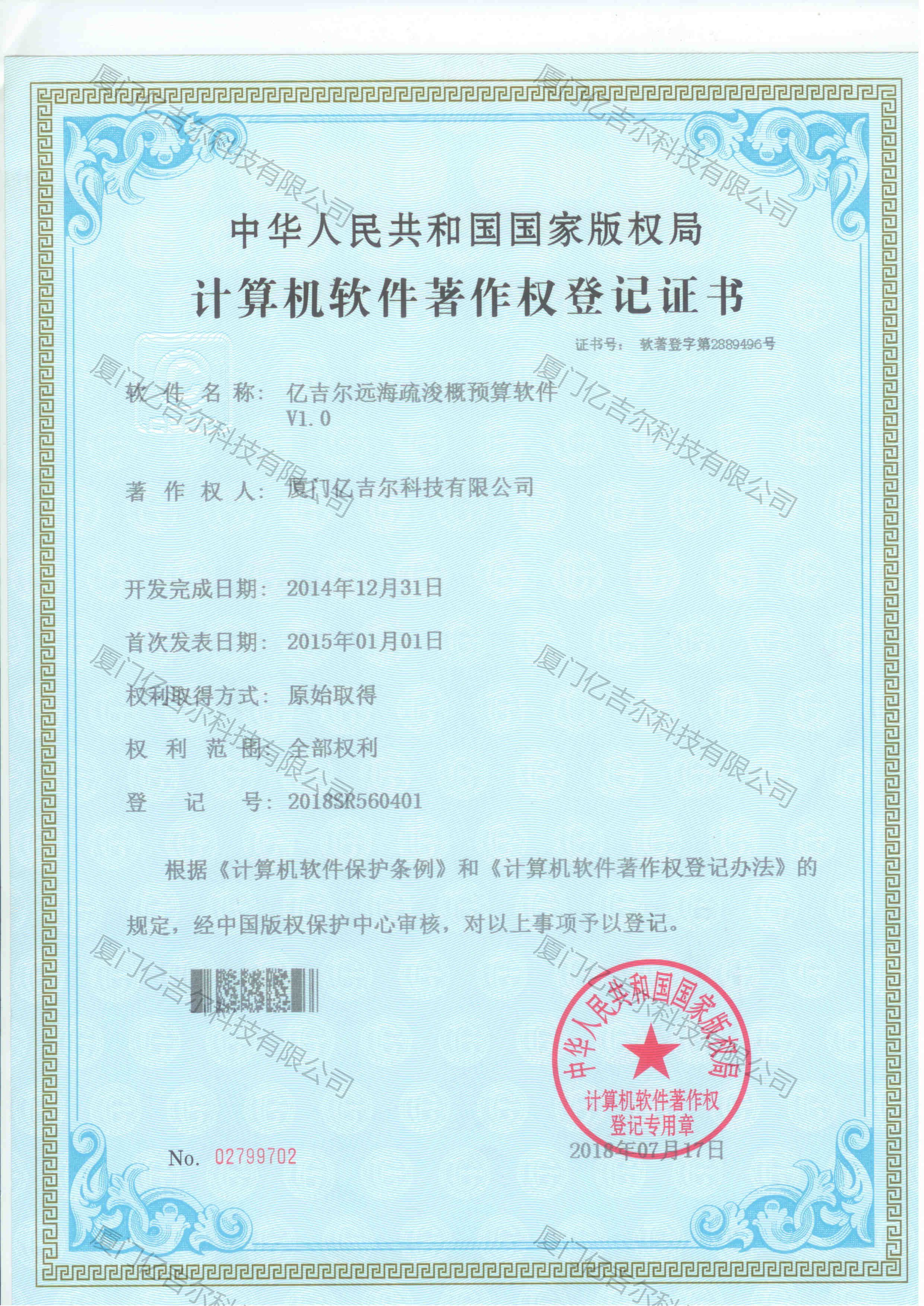 億吉爾遠(yuǎn)海疏浚概預(yù)算軟件著作權(quán)登記證書 發(fā)布日期:2018年07月17日 瀏覽次數(shù):4036 關(guān)鍵字: 公司 1/1億吉爾遠(yuǎn)海疏浚概預(yù)算軟件著作權(quán)登記證書