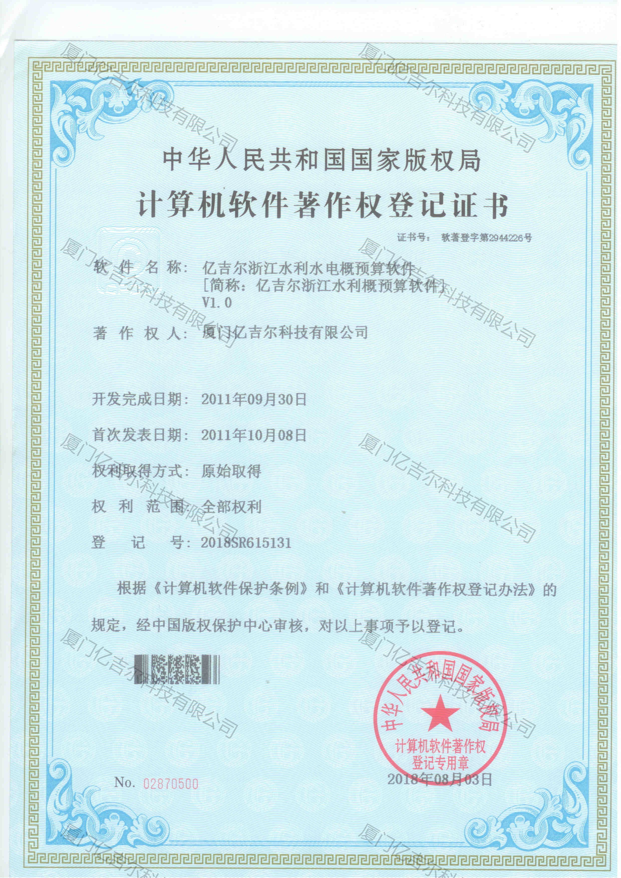 億吉爾浙江水利水電概預(yù)算軟件著作權(quán)登記證書(shū) 發(fā)布日期:2018年08月03日 瀏覽次數(shù):3978 關(guān)鍵字: 公司 1/1億吉爾浙江水利水電概預(yù)算軟件著作權(quán)登記證書(shū)